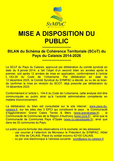 Avis de mise à disposition du public du bilan du SCoT du Pays du Calaisis 2014-2026.